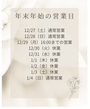 年末年始の営業日のお知らせ 年末年始の営業のお知らせ【年末年始の営業につきまして】年内最終営業日12月29日(月)16:00まで営業 年始営業開始日 1月 4日(日)より通常営業いたしますお早めにご予約下さいませ。・池田店・川西店 2025年10月31日